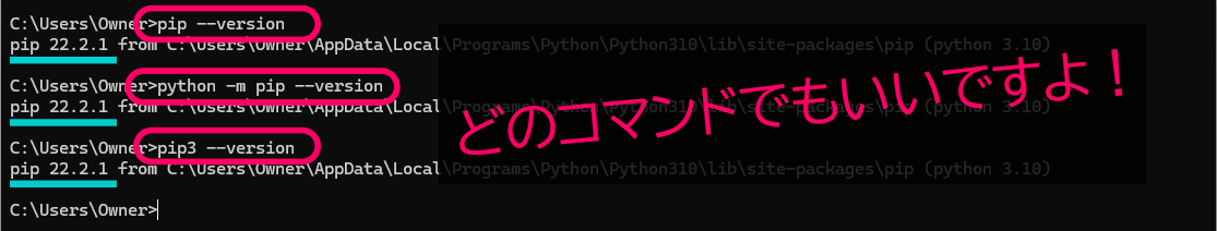 pip 23.0.1 from /usr/lib/python3/dist-packages/pip (python 3.11)pip 23.2.1 from C:\Users\yourname\AppData\Local\Programs\Python\Python311\Lib\site-packages\pip (python 3.11)どんな形式でも、バージョン情報が表示されればOKです。