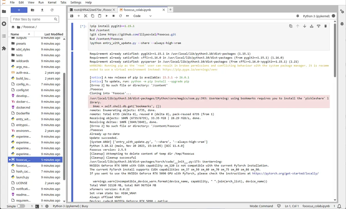 Runpod内で現存するFooocusのテンプレートでは、Fooocusを直接開けず、JupiterLabでFooocusColabのターミナルからリンクを取得してFooocusを立ち上げます。