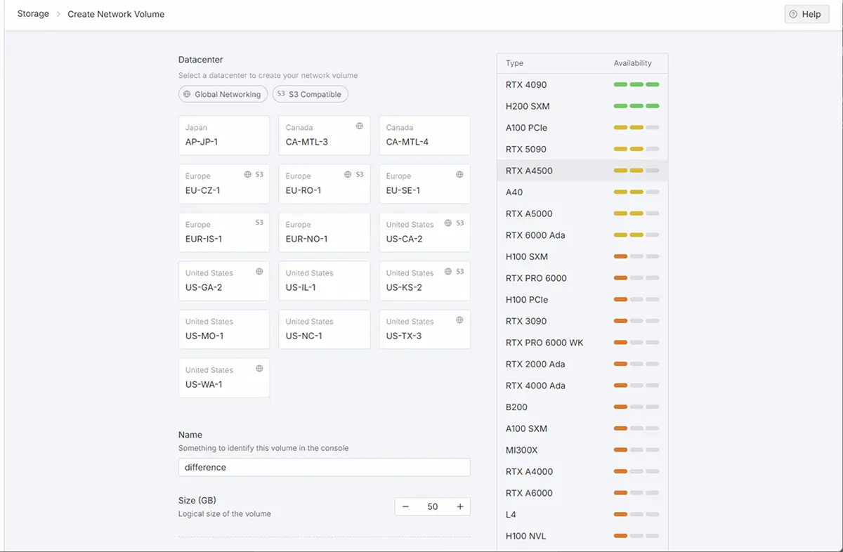 使用したいテンプレートで、どのGPUが使えるか確認してボリュームを作成