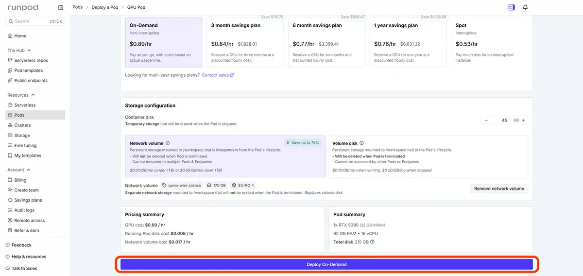 「Deploy on Demand」(オンデマンドで展開)をクリックしてPodsを起動
